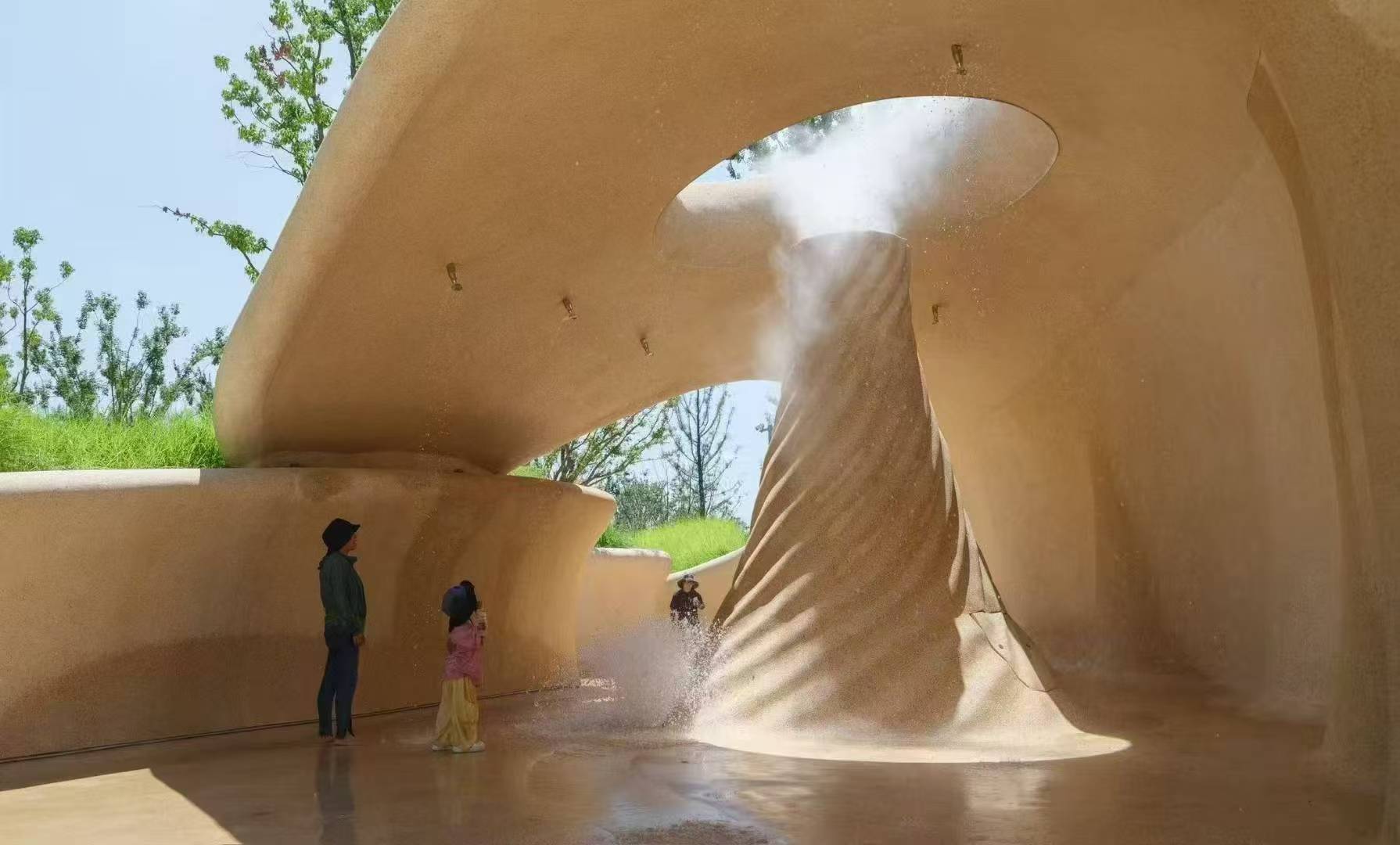 以江灘沙洲為靈感,將江水沖刷的肌理化為曲折的峽谷與翻卷的浪花。人在其中穿梭,水以或細(xì)膩或奔放的姿態(tài)迎面而來,嬉戲、環(huán)繞、輕撫,帶來沉浸式的戲水體驗(yàn)。